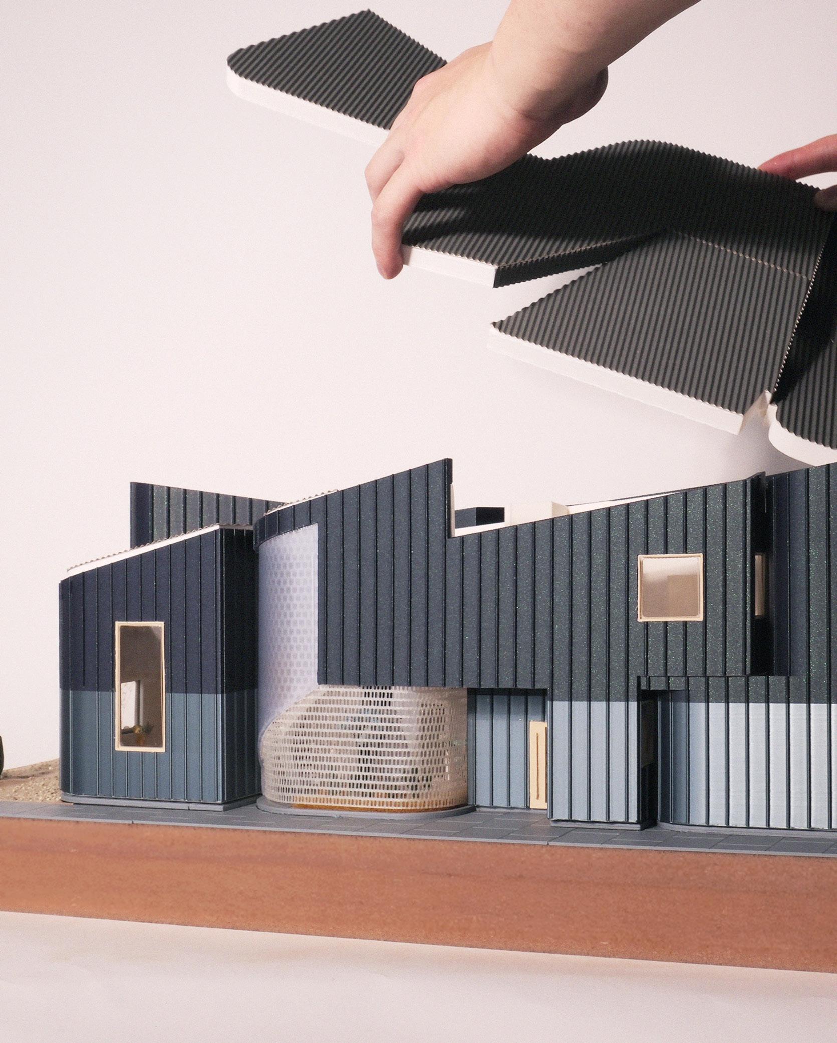 The facade uses a Pohl rainscreen system with pre-punched wall brackets. The hidden pin system facilitates the overall assembly. The roof features metal tiles, with a continuous transition from the roof to the wall and vertical surfaces, following the profile of the tiles.
