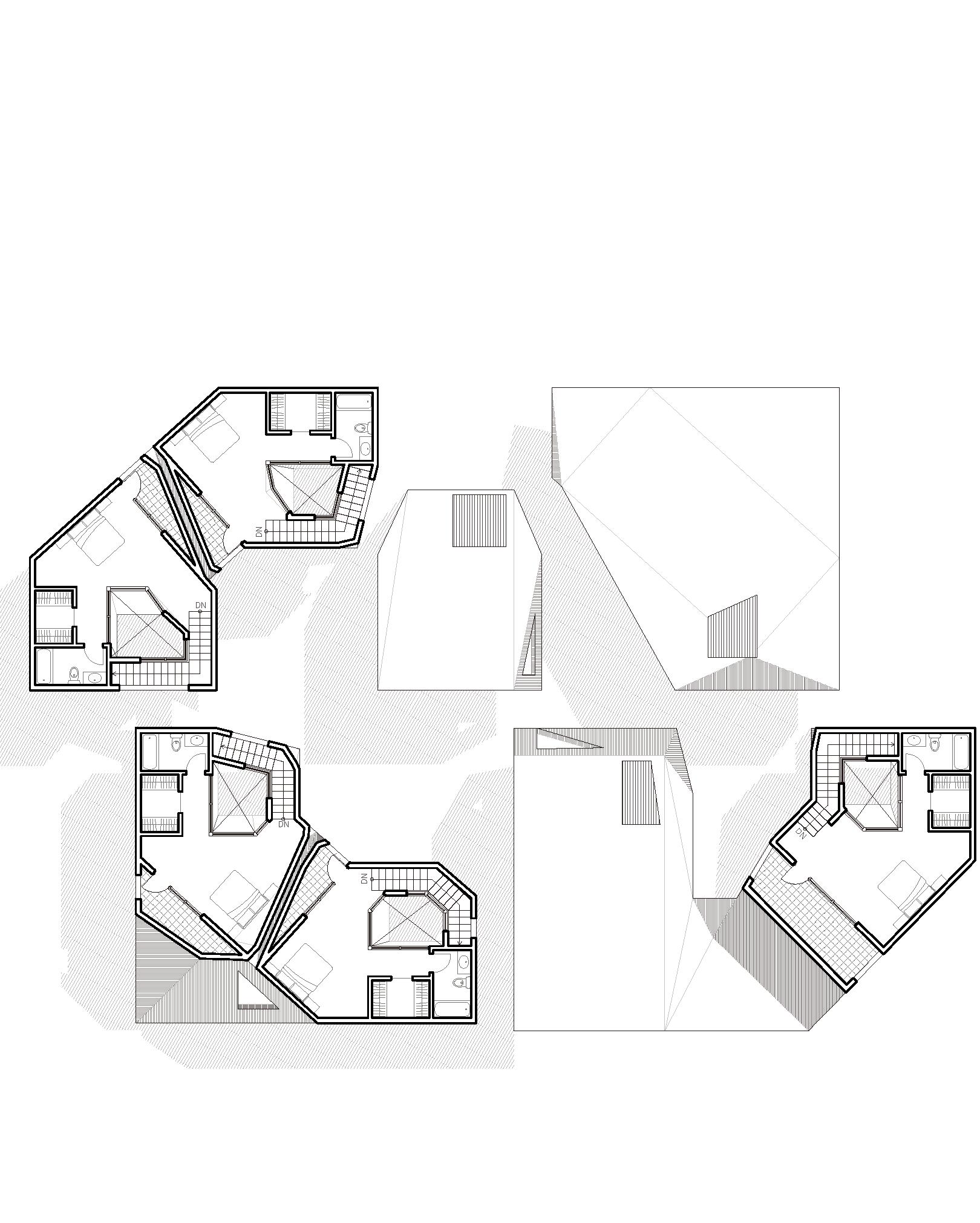 The massing strategy introduces a dynamic dialogue between solidity and openness. Staggered footprints and subtly rotated volumes create distinct living spaces while blending harmoniously with the landscape, giving each unit a unique architectural identity.