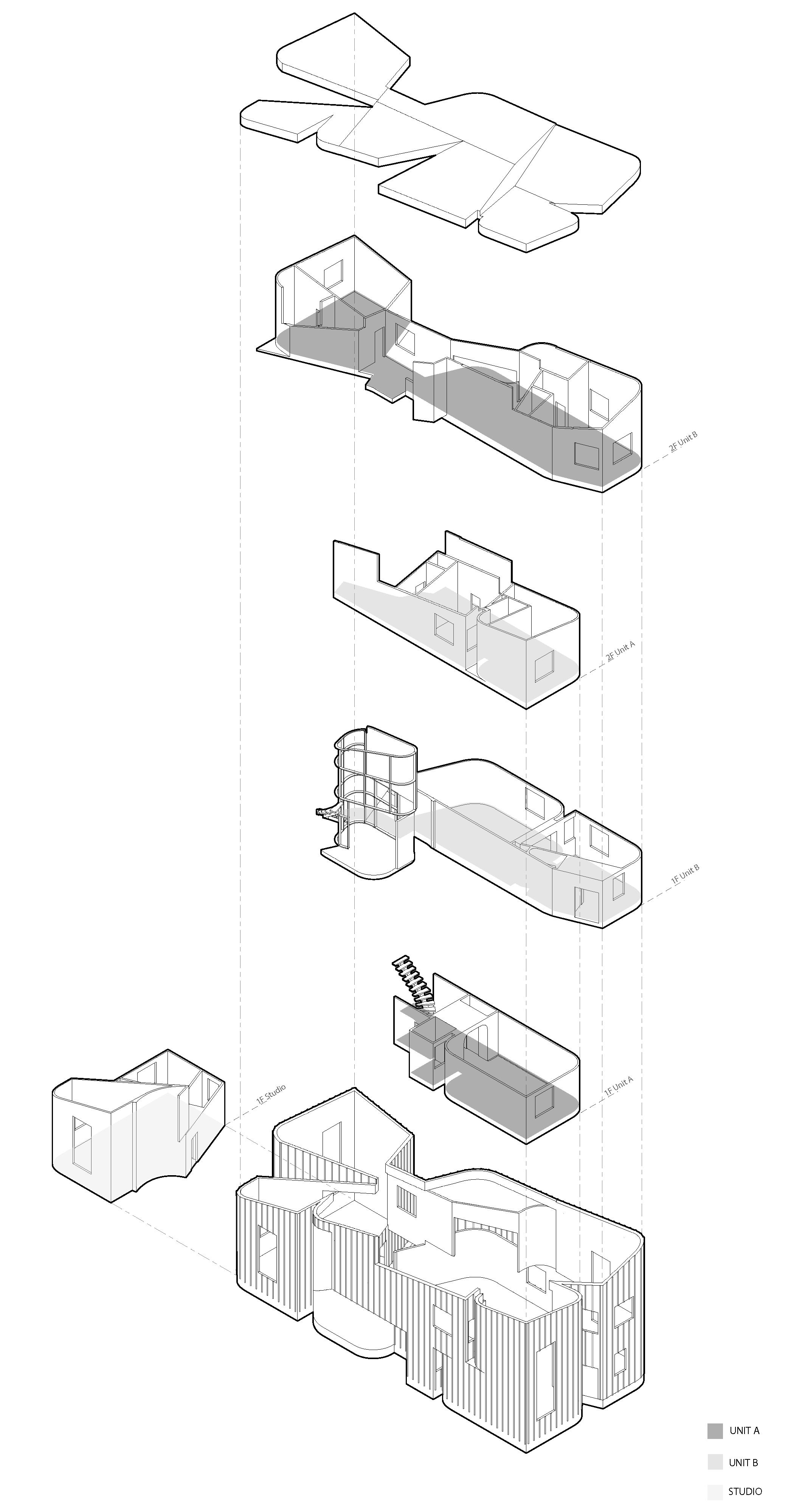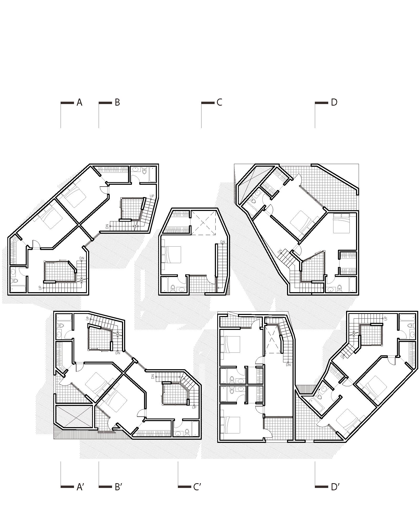By inverting conventional stacking logic, this diagram explores the spatial and social implications of interlocked vertical dwelling units. Unit A on the first floor is positioned directly beneath Unit B on the second floor, while Unit B on the first floor supports Unit A above. This deliberate crossover disrupts the expected vertical continuity of individual units, generating a layered system of occupancy. Circulation paths are carefully choreographed to mediate between overlapping territories, thereby softening the threshold between levels. The interweaving of vertical access blurs boundaries between public and private, upending conventional notions of hierarchy and autonomy in multi-unit housing.