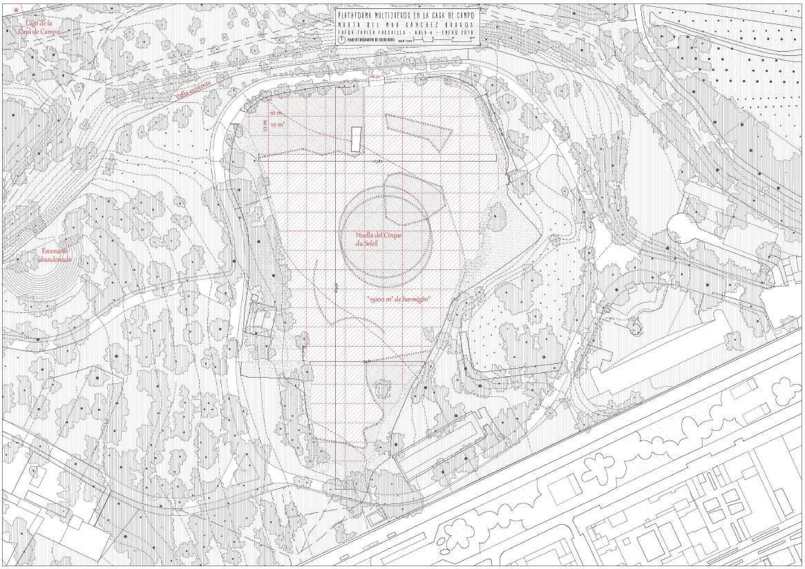 Se busca revivir esta losa, tallándola y, mediante actuaciones que aparecen y desaparecen entre los árboles, convertirla en un lugar de oportunidad constante, además de generar en su cota más alta un pabellón de madera que emerja de entre los árboles, aportando nuevas sombras y que pueda parecer un “esqueleto” al que su propia colonización por los “jugadores” le dará una vida que contagiará al entorno, ya que el edificio respira y permite ver todo su interior. De esta forma, el conjunto podría seguir usándose para estos eventos puntuales, aprovechando las oportunidades ofrecidas por estas actuaciones y, el resto del tiempo, sería un reclamo para los vecinos de la ciudad mientras la conecta con la Casa de Campo.