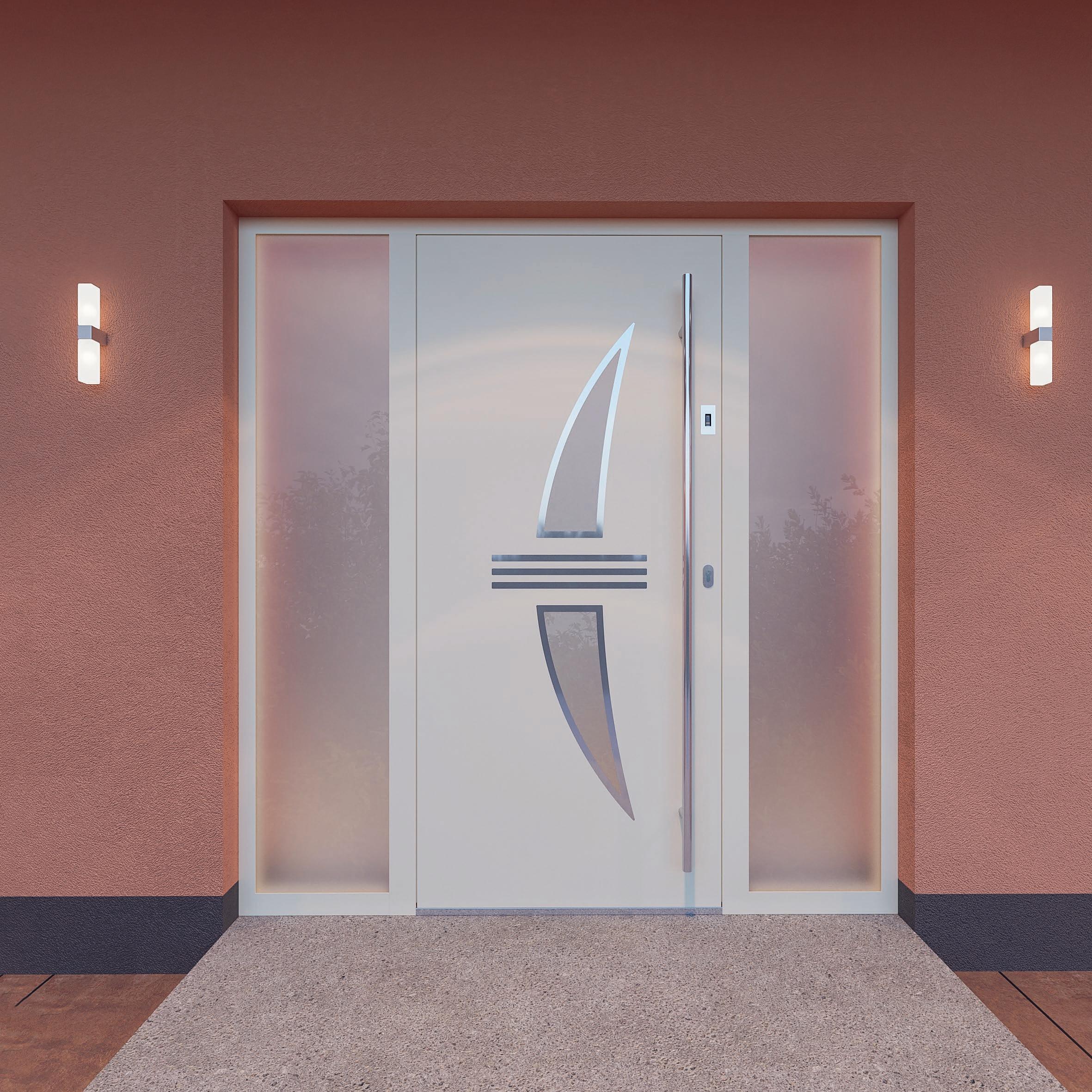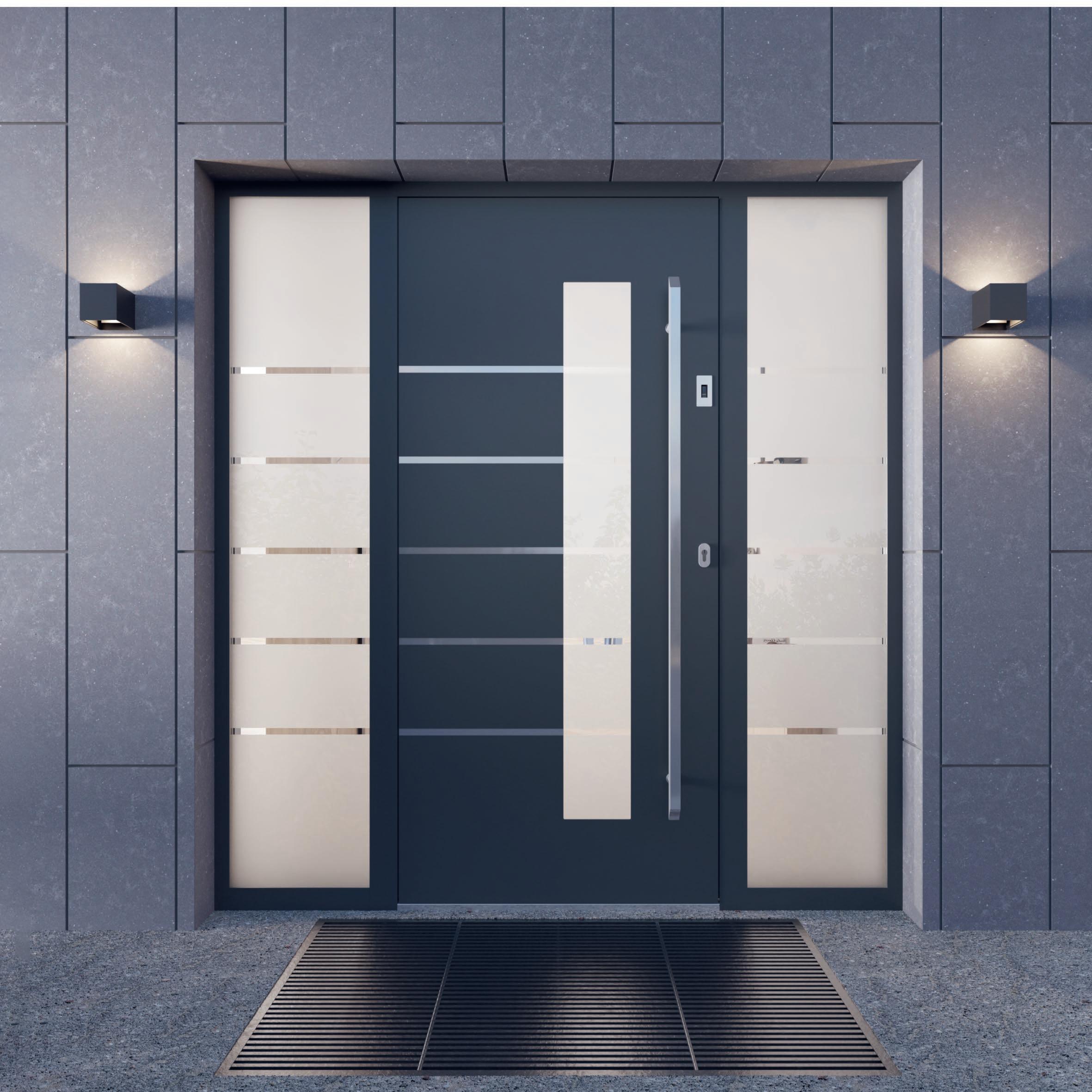Az ajtón látható nagyméretű üvegbetét kellő mennyiségű fényt enged az ingatlanba, oldalvilágító nélkül is. Abban az esetben, ha oldalvilágítóval készül, azok üvegén is futhatnak a horizontális marási csíkok (alapkivitelben teli savmart üveggel készül).