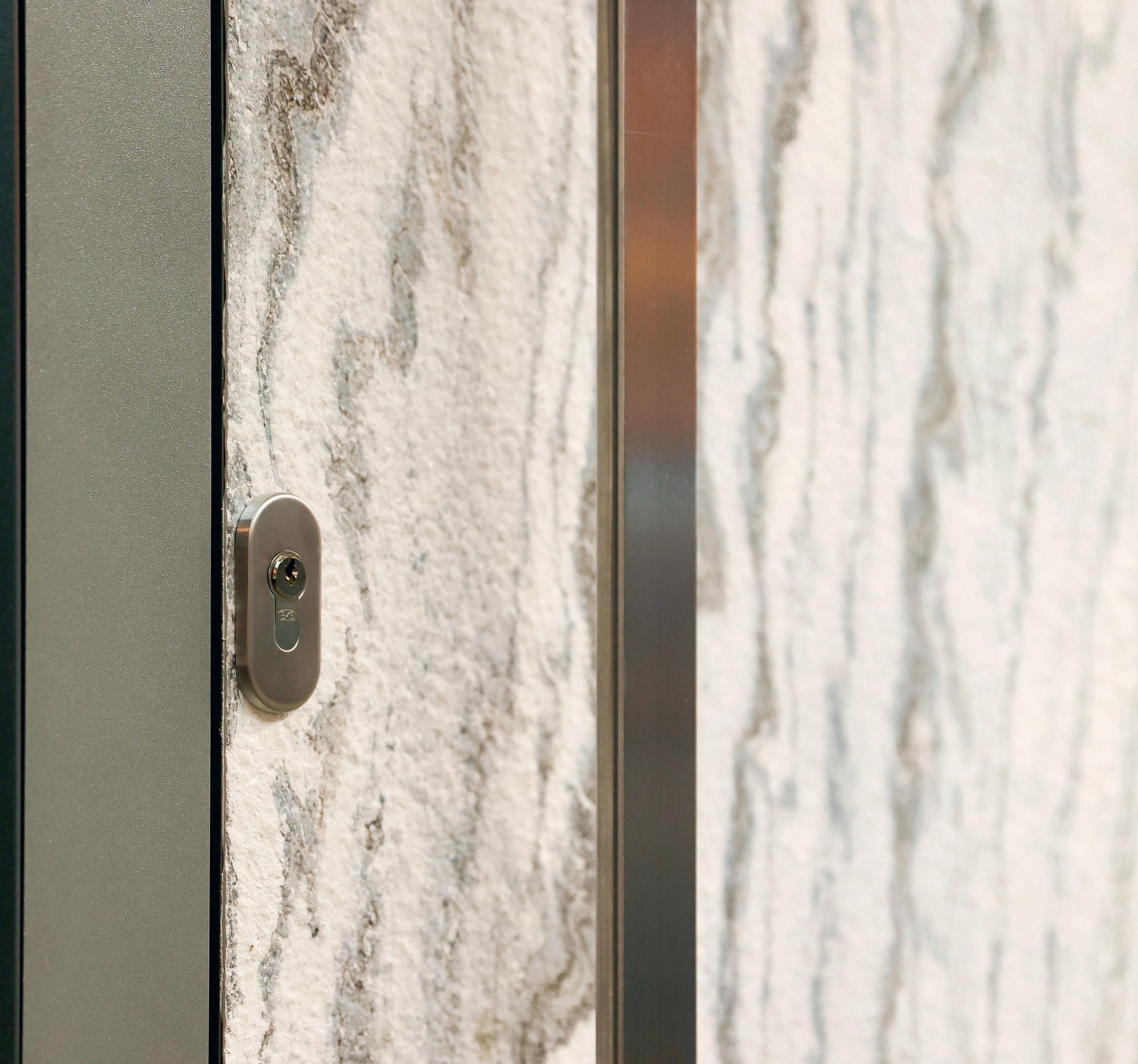 ▪ síkba záródó ajtószárny a külső és a belső oldalon egyaránt ▪ extra hőszigetelésű ajtópanel ▪ hőhídmentes ajtókeret, küszöb ▪ alumínium borítású ajtószárny ▪ rejtett pántok ▪ automata zár ▪ magas szintű betörés elleni védelem ▪ egyedi, névre szóló kivitel