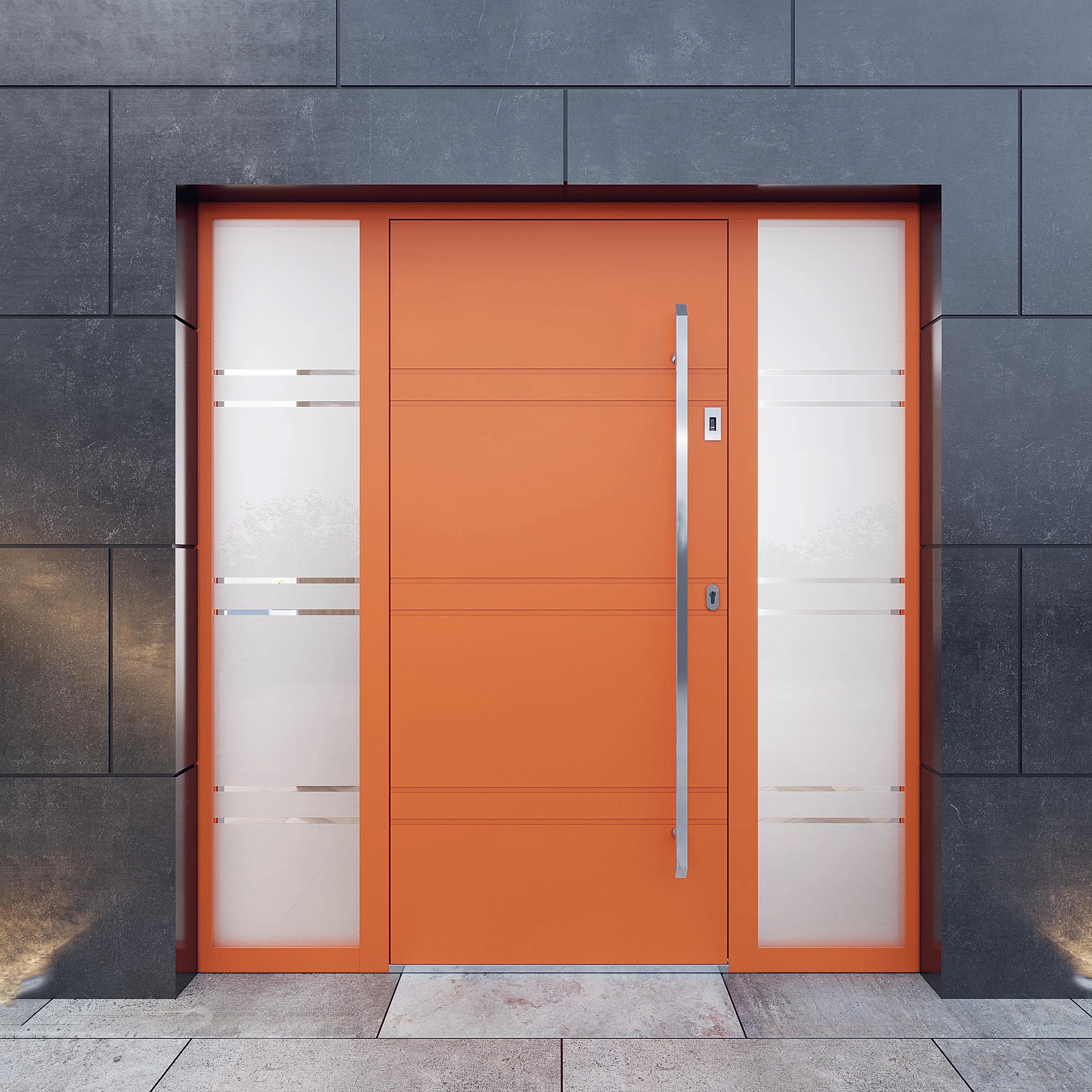 ▪ alumínium borítású ajtószárny ▪ rejtett pántok ▪ automata zár ▪ magas szintű betörés elleni védelem ▪ egyedi, névre szóló kivitel