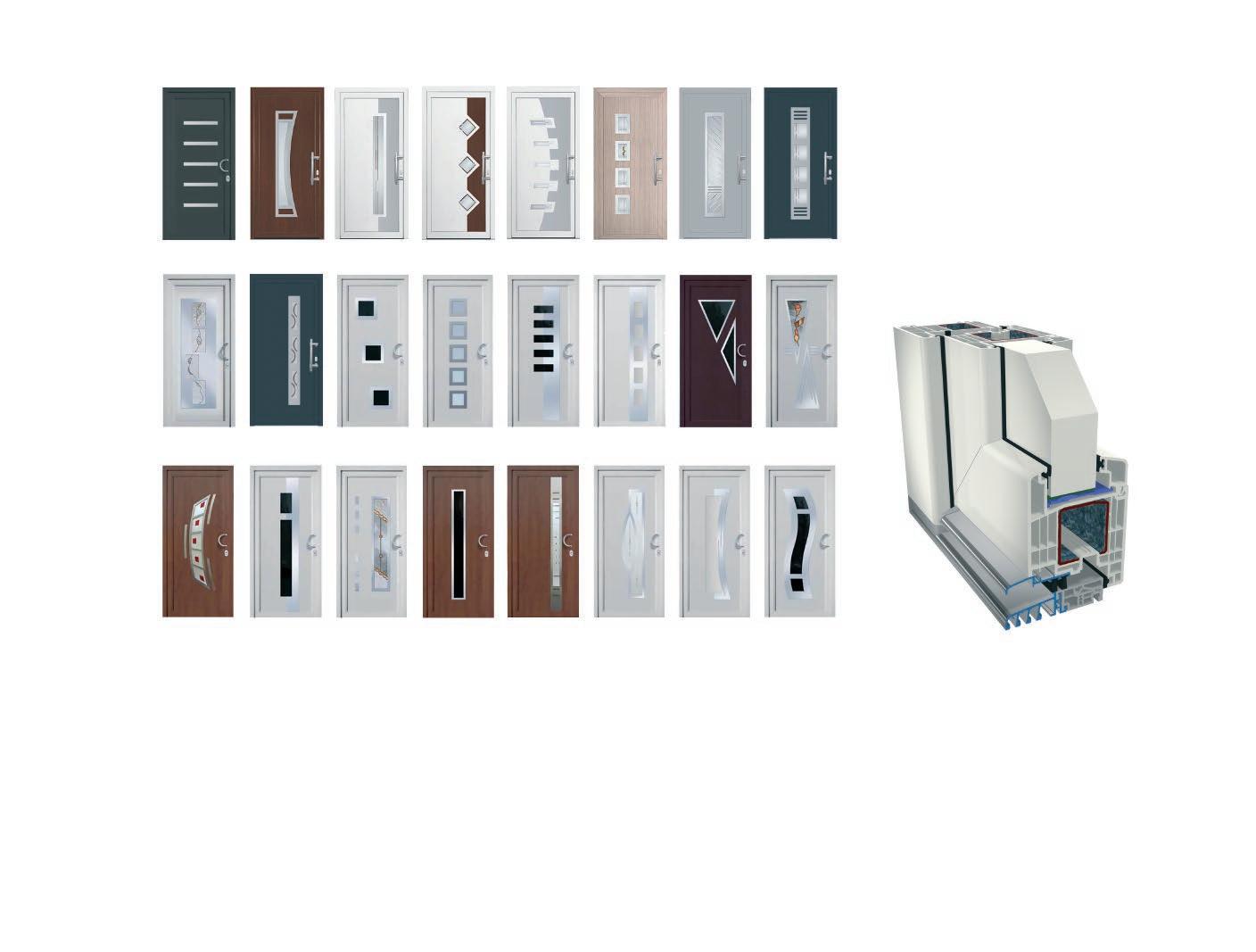 SILVER BEJÁRATI AJTÓK : ▪ 74 mm−es német PVC profil ▪ 6 légkamrás tok- és szárny profil ▪ Kétszeres tömítés ▪ Fehér/színes/ fadekor/akril kivitel ▪ Panel 24 v. 44 mm ▪ Változatos panelekkel 24 variációban