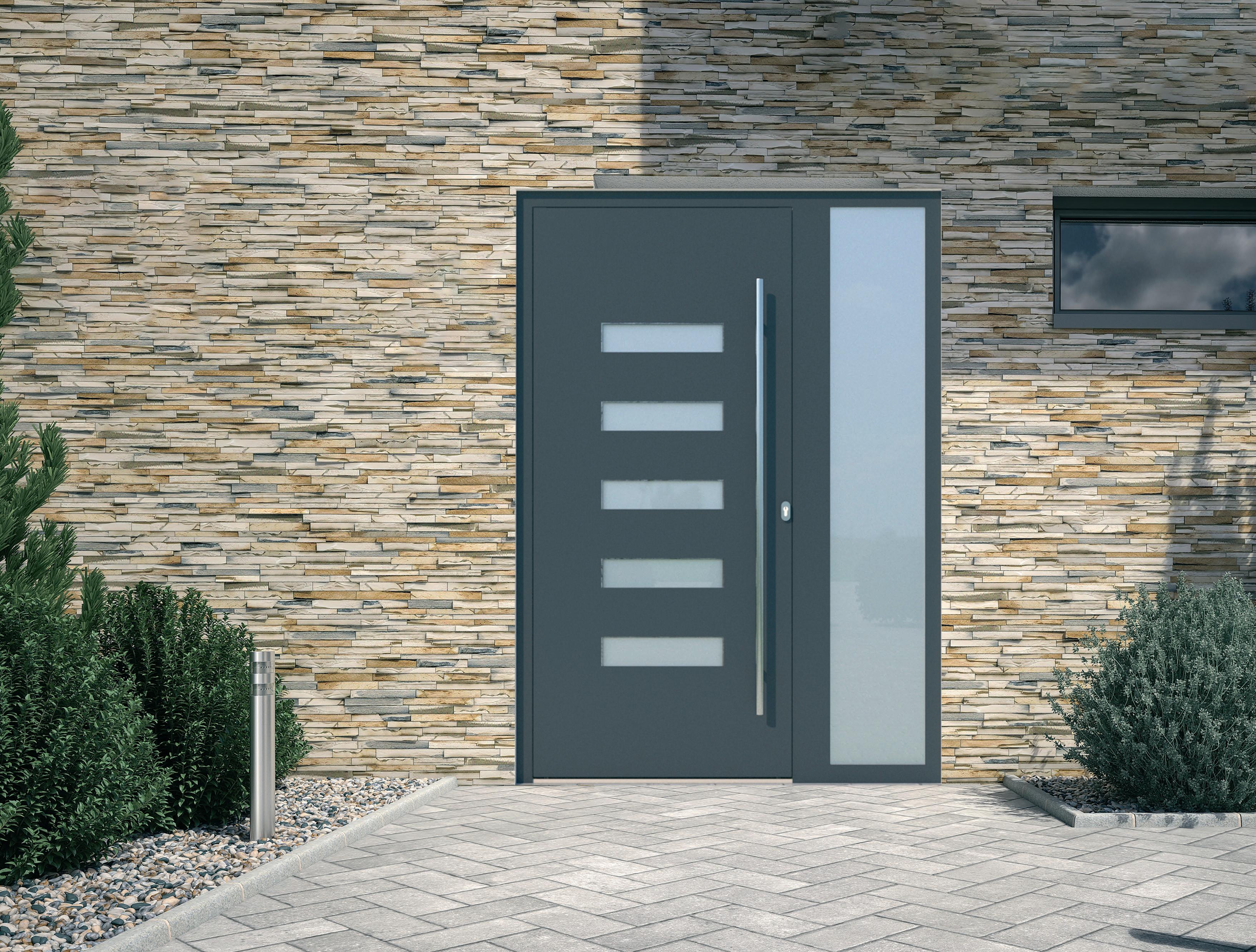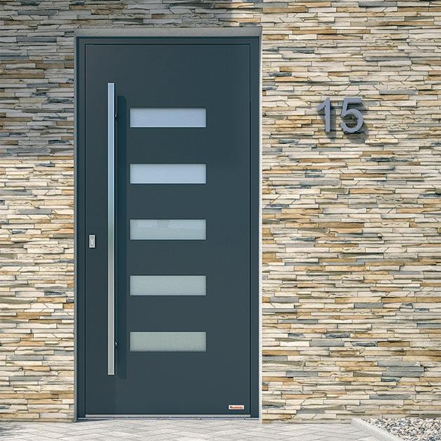 Le nostre porte d’ingresso in alluminio sono fornite di serie con una serratura a barra a due scrocchi, conforme allo standard di resistenza all’effrazione RC2. Un design a 4 scrocchi ancora più sicuro è disponibile come opzione. Queste sono serrature automatiche, che si bloccano immediatamente quando la porta viene chiusa - questo può essere disattivato sulla versione TE (modalità giorno).