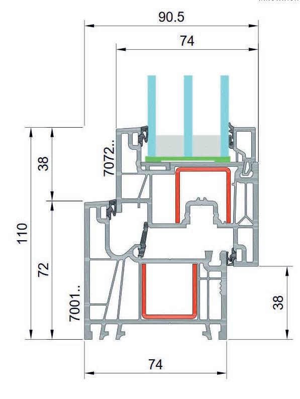 74 mm profilo tedesco in PVC: telaio a 6 camere d’aria, anta a 6 camere d’aria. Isolamento termico di profilo: Uf=1,2 W/m2K.