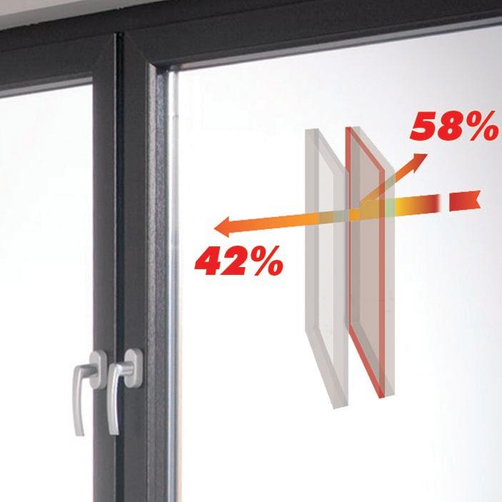 In estate, qualche stanza, specialmente una giardino inverno, può diventare insopportabilmente calda. Vale quindi la pena di scegliere una finestra con vetro che riflette il calore, oltre a usare le tende. Il vetro con un rivestimento ClimaGuard Solar riflette il 58% del calore del sole, quindi la casa o l’ufficio si riscaldano molto più lentamente. Il sottile strato protettivo metallico è invisibile all’occhio, spesso solo 2 millesimi di un capello, che blocca a malapena l’ingresso della luce. Il rivestimento della barriera termica è essenzialmente come abbassare l’ombreggiatura a metà, ma la luce entra ancora nella proprietà. Questo ha l’effetto di abbassare il costo di funzionamento dell’aria condizionata.