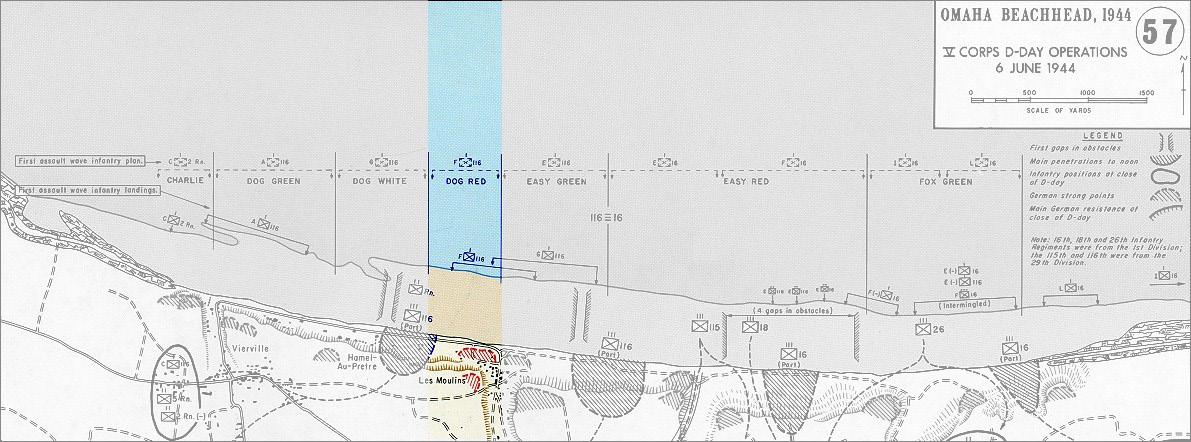 Map showing the Dog Red section of OMAHA Beach. Wikimedia Commons graphic.