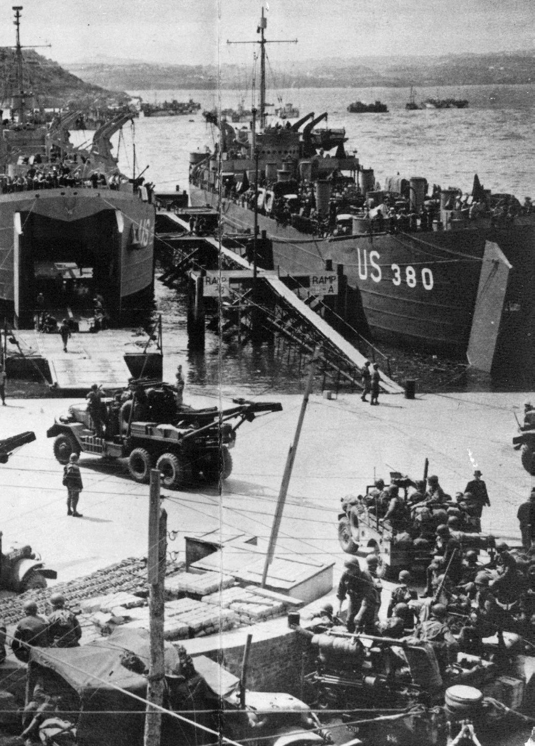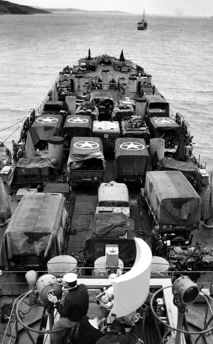 Right: Landing Ship, tank with 2.5-ton trucks loaded on the deck heads across the English Channel toward France. U.S. Navy photo