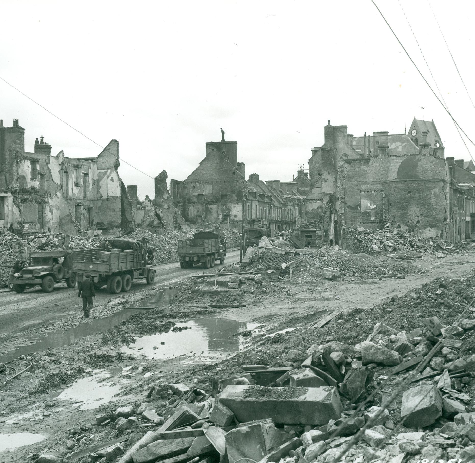 Trucks rumble through a ruined town in northern France. GCMF photo.fields. Sacks of sand were piled on the floor of the cabs as a protection against land mines. German snipers were active for several days, and enemy air raids and shellfire kept all beach personnel on the alert. Rain and mud also hindered the trucking operations.