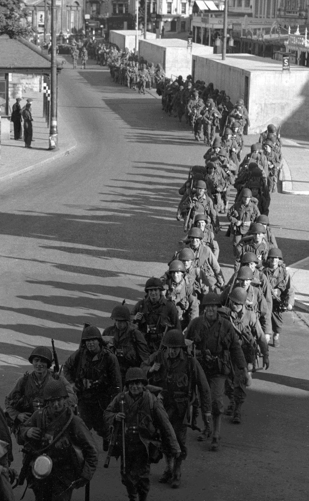 U.S. soldiers march toward the Torquay Harbor, Devon, England. Torquay Museum photo.