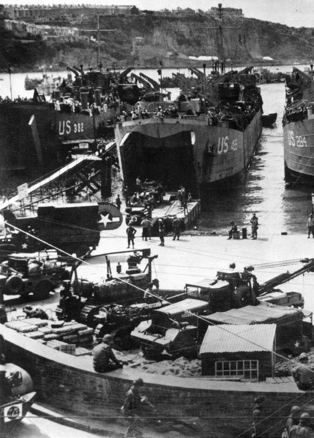 U.S. military vehicles loading at Brixham Harbor. Torquay Museum photo.