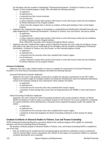 the full degree with the exception of designating “Professional Development - Certificate in Violence, Loss, and Trauma” as their intended program of study. They will submit the following materials: • an application • an application fee • a transcript from their current university • two (2) references • a written statement of goals which speaks to their desire to work with trauma victims (see the Guidelines for Written Statement on the Program website). • a letter from their program chair or director as evidence of their good standing in their current degree program. • Applicants who completed their degree in Counseling or a related Behavioral Health field at Marshall University may apply designating the “Professional Development - Certificate in Violence, Loss, and Trauma” and need to submit: • an application • an application fee • a written statement of goals which speaks to their desire to work with trauma victims (see the Guidelines for Written Statement on the Program website). (Note: Official MU transcripts will be obtained through the Banner system.) • Applicants who have completed their degree outside of Marshall University and wish to take the Certificate courses must apply in the same way as one would apply for the full degree with the exception of designating “Professional Development - Certificate in Violence, Loss, and Trauma” as their intended program of study. • an application • an application fee • a transcript from the university where they completed their master’s degree • two (2) references • a written statement of goals which speaks to their desire to work with trauma victims (see the Guidelines for Written Statement on the program website). Licensure/Certification Applicants who wish to take a limited number of courses to complete the requirements for Licensed Professional Counselor or for their School Counseling certification will submit the following materials: Licensed Professional Counselor Applicants Applicants who need to take graduate coursework to complete the education requirements for the LPC in West Virginia are invited to apply as non-degree students (see Admission Classifications under the Admissions Information section in the Graduate Catalog for more information). These students will submit: • an application • an application fee • a transcript from the university where they completed their master’s degree. • a statement of intent stating what courses they are being directed by the WVBEC or other state board to take School Counseling Certification Applicants Applicants who wish to obtain the School Counseling Certification after having completed a Master’s in Mental Health Counseling are invited to apply as non-degree students as well. However, the courses specified for completing the school certification will be determined by a transcript review completed by program faculty. The students will submit: • an application • an application fee • a transcript from the university where they completed their master’s degree. • a statement of intent that designates the School Counseling certification as their purpose for taking courses