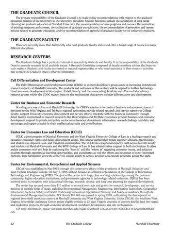 Center for Environmental, Geotechnical and Applied Sciences CEGAS was established in May 1993 through the cooperative efforts of the presidents of Marshall University and West Virginia Graduate College. On July 1, 1998, CEGAS became an affiliated organization of the College of Information Technology and Engineering (CITE). The goal of the center is to forge close working relationships among the business community, higher education institutions, and government agencies in technology related endeavors. CEGAS has been involved since its inception with educational offerings, research, service, and long-term planning for regional development. The center has secured more than $10 million in external contracts and grants for research, development, and service projects in multiple fields of study, including Environmental Management, Engineering, Information Technology, Geographic Information Systems, Safety and Health Technology Innovation, Specialized Training, and business assistance through its Environmental Management Incubator. WV Senate Bill 603 was passed in spring 2005, authorizing the development of regional brownfield assistance centers at Marshall University and West Virginia University. Under CEGAS, the Southern West Virginia Brownfields Assistance Center assists eligible entities in 22 West Virginia counties to convert derelict land into useful and productive property through economic development, workforce development, and site revitalization. For more information, please visit www.marshall.edu/cegas or contact CEGAS at (304) 696-5453 or cegas@marshall. edu.