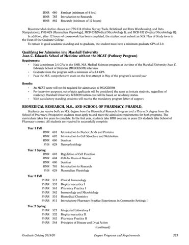 BIOMEDICAL RESEARCH, M.S., AND SCHOOL OF PHARMACY, PHARM.D. Students can receive both an M.S. degree from the Biomedical Research Program and a Pharm.D. degree from the School of Pharmacy. Prospective students must apply to and meet the admission requirements for both programs. The curriculum takes five years to complete. In the first year, students take BMR courses; in years 2-5 students take School of Pharmacy courses. All students are required to successfully complete: Year 1 Fall