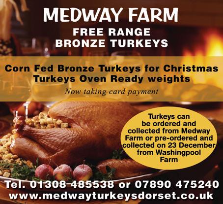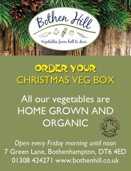 And don’t forget to organise your Christmas meal from local suppliers. Order your home grown, organic vegetables with a special Christmas Gift Box from Bothen Hill in Bothenhampton. Visit www. bothenhill.co.uk. And order your delicious free range bronze turkey from Medway Farm. Visit www. medwayturkeysdorset.co.uk for full details.