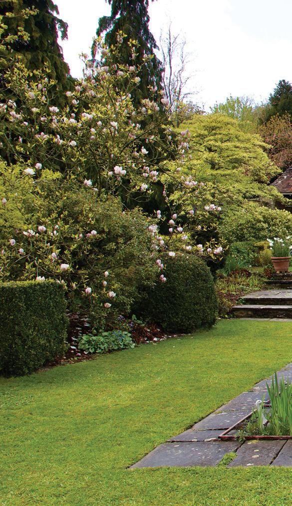 garden.’ It’s also popular with visitors ‘absolutely wonderful scent and the bees love it.’ She also cites euphorbias as another favourite, ‘with the sort of limey green flowers’. Later on she likes the flowering cornices. ‘Roses I would like’ she says, ‘but the deer like them even more, so I have to limit those.’ She points to one that has been ‘nibbled right down—so disappointing.’ Much of the garden is colourthemed but the thing Mary doesn’t like is yellow and pink. ‘I just can’t marry those two together.’ She has placed things between those colours to ‘dilute’ their clashing.