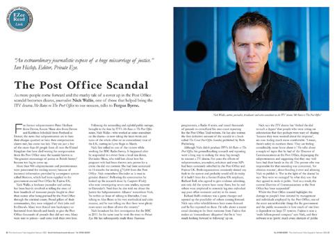 The rest of the story is well documented by journalists at Computer Weekly, Private Eye and by investigative journalist Nick Wallis for Panorama and his own blog. Nick is starting a tour telling the story at the Marine Theatre, Lyme Regis in March. For more on his view of the enormous issues now facing the Post Office, the software developer Fujitsu and the Government, visit www.marshwoodvale.com and read his interview in our February issue. This story is also well recounted in the ITV drama Mr Bates vs The Post Office