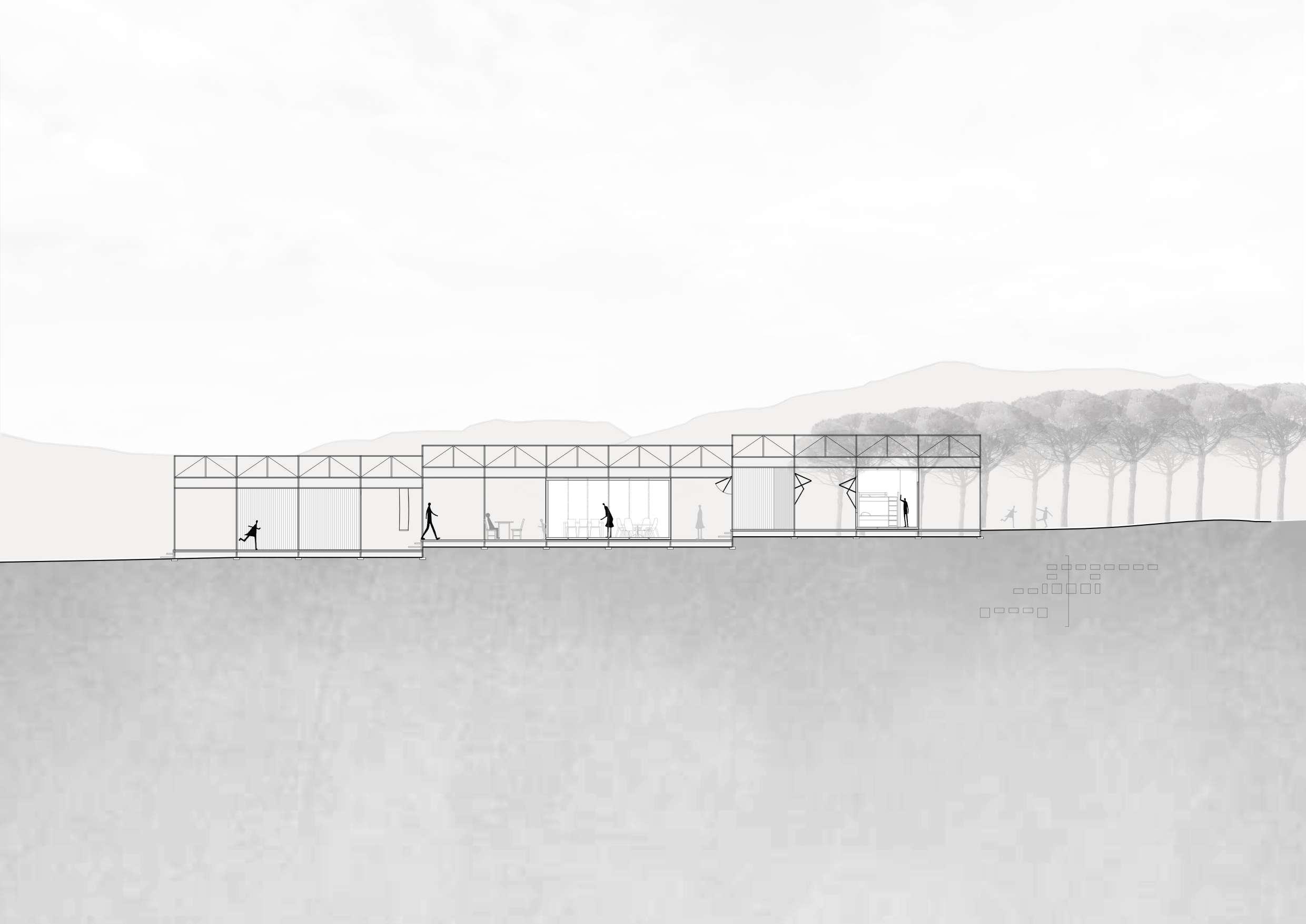 Ubicado en Tarifa, se trata de un campamento de Kitesurf que hace de elemento de transición entre el mar y el bosque, entre la arena y el agua, entre el dentro y el fuera. El campamento está creado a partir de tres bandas longitudinales siguiendo las propias bandas del entorno (mar, arena, duna, bosque) diviendo cada una de ellas en un espacio con una finalidad diferente. La primera de ellas la más próxima al mar concentra los espacios dedicacos al kitesurf como son los almacenes y las aulas; si continuamos subiendo nos encontramos una segunda banda, en ella los espacios de recreo y de ocio y finalmente en la tercera banda, oradada por el bosque las zonas más privadas de hbaitaciones y baños.