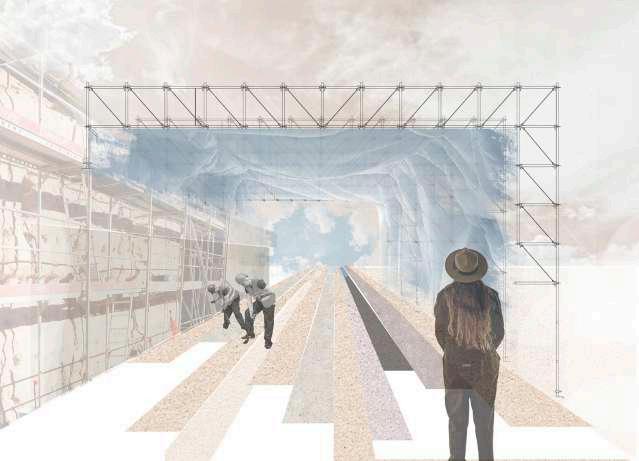 En mi propuesta he querido unir ambos mundos a través de una doble piel, por un lado una primera piel exterior y estructural visible desde ambos lados de la excavación pero no desde el interior. En el interior nos encontramos una segunda piel, una cubierta de textiles unidos entre ellos que nos tapan de la estructura y nos envuelven en otro ambiente, en un ambiente de luces y sombras arrojadas por el andamio exterior.