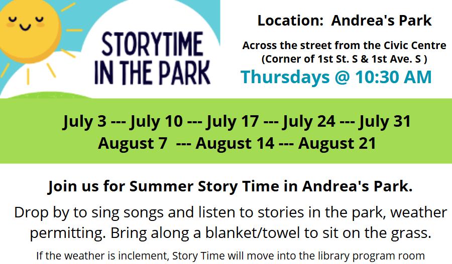 In summer, we move our Storytime program into Andrea’s Park. The FREE drop-in program is open to all ages, but best suited for ages 2 – 6. In the case of poor weather, the program will be held in the library program room.