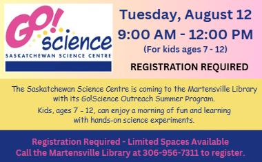 The SK Science Centre will be at the library for a 3-hour program on Aug. 12. Kids will learn about and do experiments on fun science topics. The FREE program is for kids ages 7 - 12. Registration is required at the library.