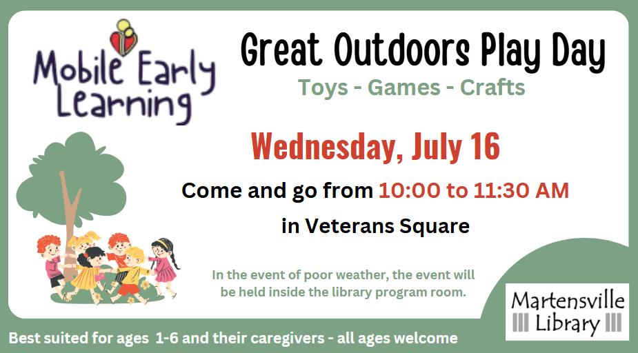 Mobile Early Learning will be at the Martensville Library with their summer outdoor play program. This FREE drop-in program helps you connect with your child through play and participation in fun activities that help prepare your child for school. The program is designed for ages 1-6, but all ages and abilities are welcome to attend. The program will take place in Veterans Square but will move into the library program room in poor weather.