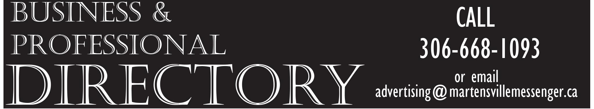 Get Your Business Noticed! Call the today and ask about our AFFORDABLE advertising 306-668-1093 advertising@martensvillemessenger.ca ARTENSVILLE E S S E N G E R M