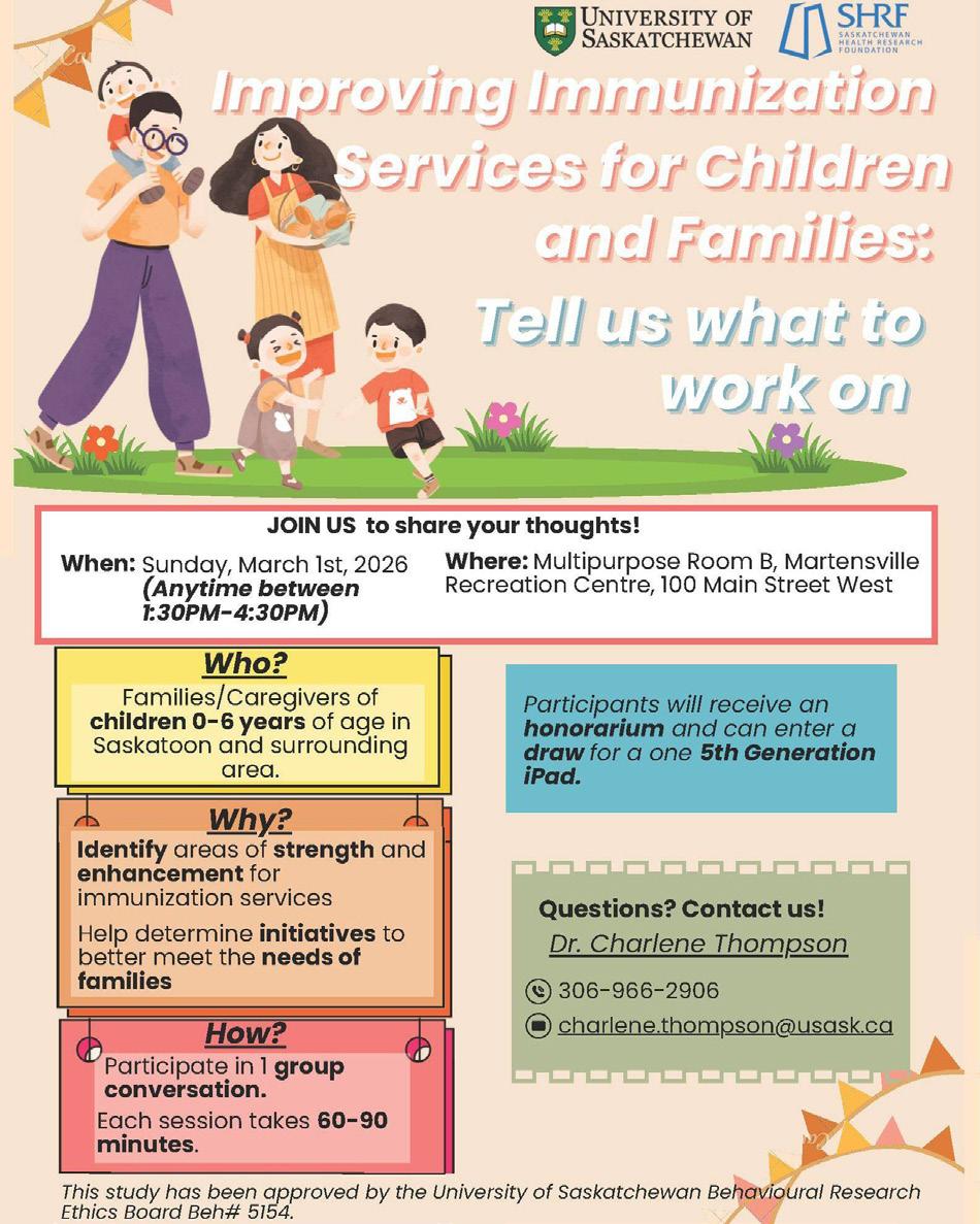 The University of Saskatchewan, in partnership with the Saskatchewan Health Research Foundation (SHRF), is hosting a community engagement session focused on improving immunization services for children and families. The event is specifically geared toward families and caregivers of children aged 0–6 years in Saskatoon and the surrounding area.