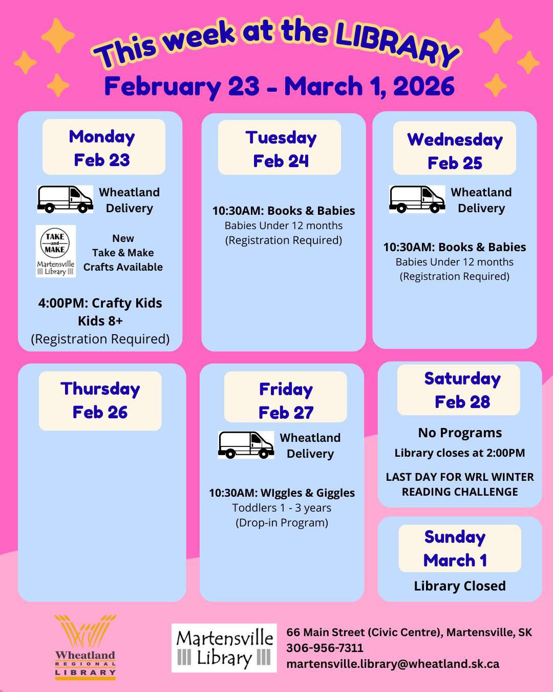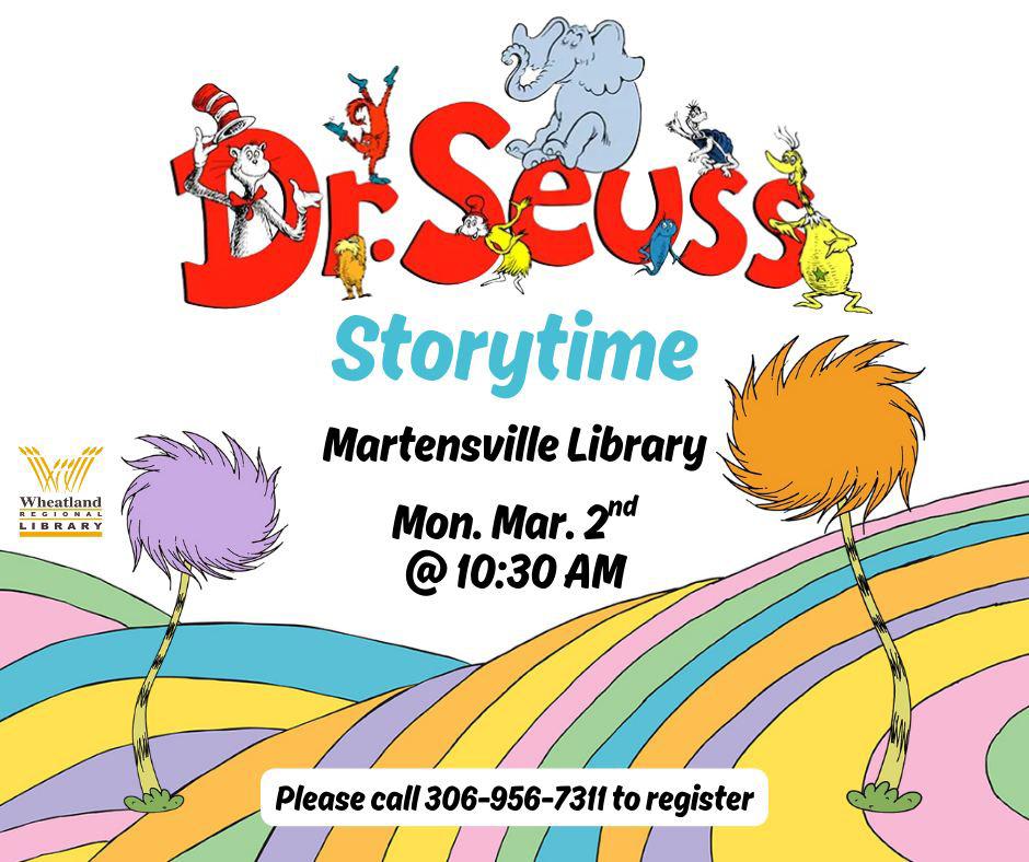 Families are also reminded about a special Dr. Seuss Storytime taking place on Monday, March 2nd at 10:30am. The Programming Manager from the Wheatland Regional Library head office will be visiting Martensville to read Dr. Seuss stories and lead a fun craft activity for children.