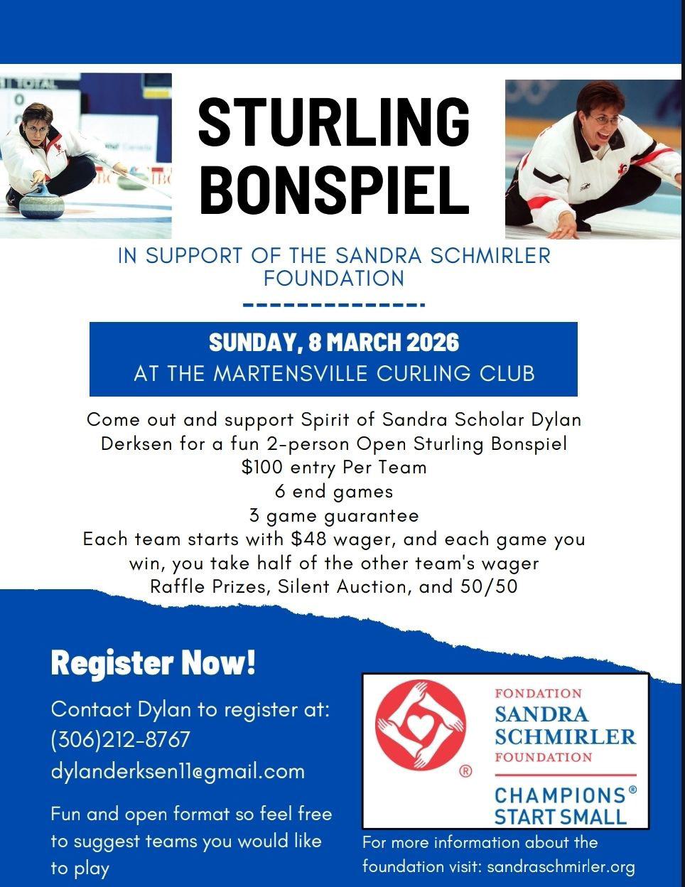 The Martensville Curling Club will be hosting a special fundraising event on Sunday, March 8th, as Spirit of Sandra Scholar Dylan Derksen brings a 2-person Open Sturling Bonspiel to town in support of the Sandra Schmirler Foundation.