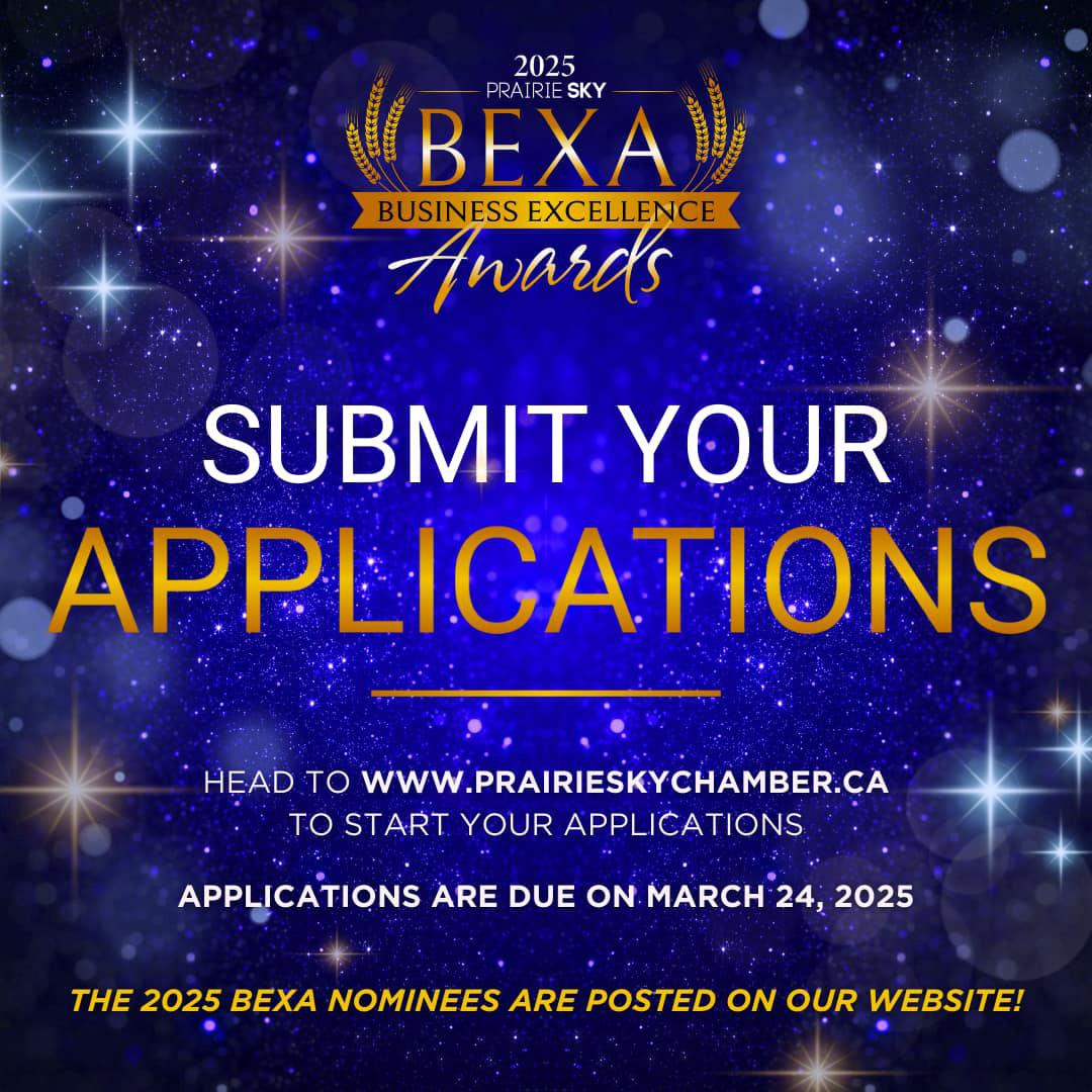 The Prairie Sky Chamber of Commerce Business Excellence Awards (BEXA) will take place on May 23, 2025, where businesses from around the region will be celebrated for their contributions and achievements.