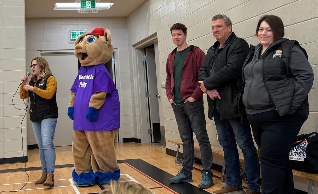 ABOVE L-R: Ms. Troupe-Logue, Telemiracle Teddy, Luke Johner, Brad Johner and Telemiracle co-chair Karen.