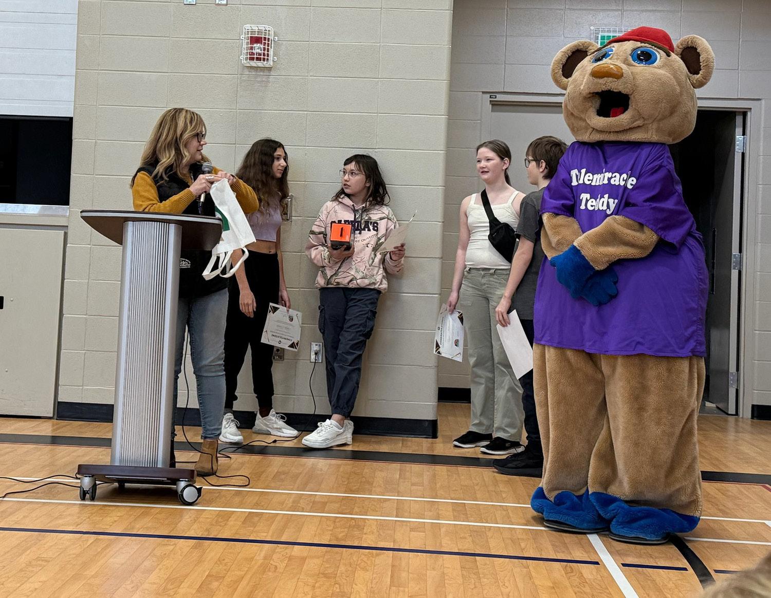 Ms. Troupe-Logue, who is a teacher at Lake Vista, is also a Telemiracle Chair this year. She did a presentation talking about what Telemiracle is all about along with Telemiracle Teddy, Telemiracle tour participants Luke Johner, Dad