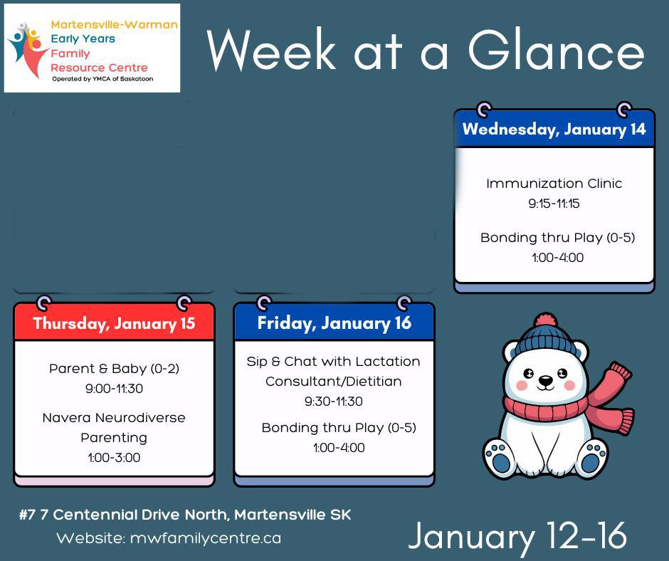 For more information on programming and drop-in sessions you can stop by the Centre at #7 – 7 Centennial Drive Monday – Friday 9am-4pm, email mweyfrc@ ymcasaskatoon.org, or call 639-398-7609.