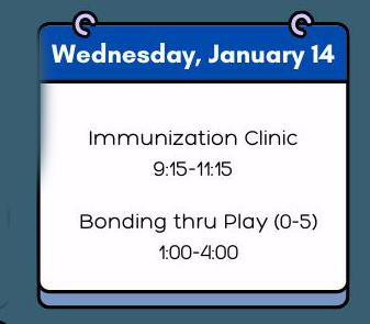 • Bonding thru Play with a visit from the Early Childhood Intervention Program –January 19, 9:30 AM to 11:45 AM.