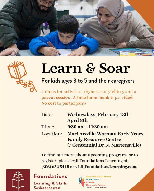 Beginning February 18, Foundations Learning will be offering their Learn & Soar program for children ages 3-5 and their parents. This eight-week, literacy-based program will be held on Wednesdays until April 8. The program features activities, rhymes, storytelling, and a session for parents. To register or for more information, please call Foundations Learning at (306) 652-5448 or visit FoundationsLearning.com. Spaces are limited, so early registration is recommended. Please note that registration is for the full eight weeks.
