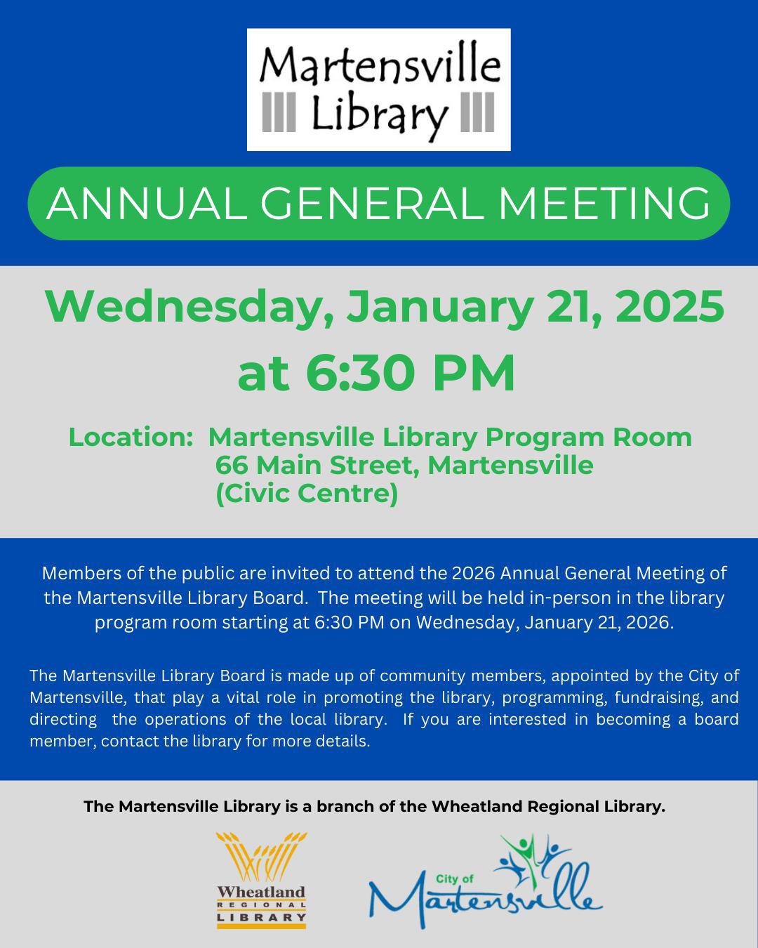 Members of the public are invited to attend the 2026 Annual General Meeting of the Martensville Library Board. This meeting will be held in-person in the library program room starting at 6:30 on Wednesday, January 21.