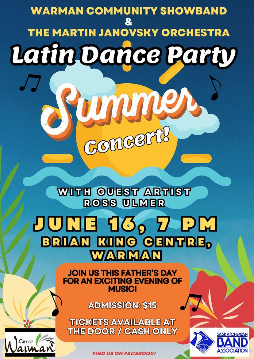 Tickets for this exciting Father’s Day evening are $15 and can be purchased from Warman Community Band members or by cash at the door. A Latin Dance Party takes place June 16th at 7 pm at the Brian King Centre in Warman where there will be plenty of room to dance to live music!