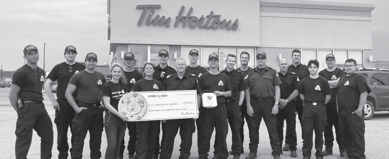 The Martensville Fire Department was presented with a cheque for just under $12,000 from the Martensville Tim Horton’s Smile Cookie campaign, which took place from May 1-7, on Wednesday, June 14th. Customers at Tim Hortons had the opportunity to purchase a smile cookie during this time, with 100% of the proceeds going towards the MFD. The MFD was contacted by the owners of the restaurant to see if they would be interested in being this year’s recipient. The raised funds will be used towards the purchase of new AED’s (automated external defibrillators) for the local fire department.