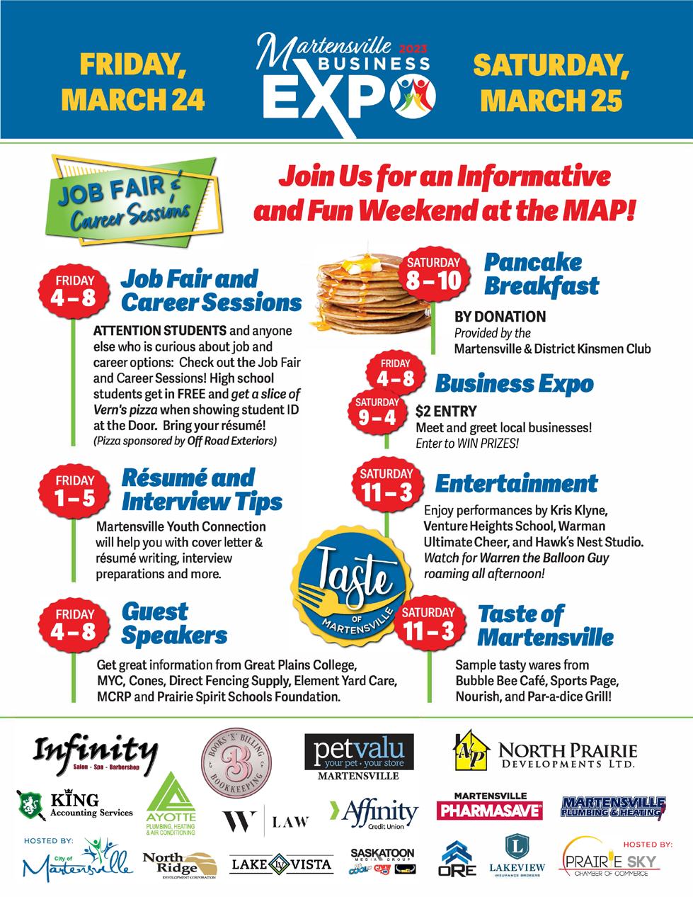 Friday, March 24th Schedule – 1pm-5pm Resume and Interview Tips with Martensville Youth Connection; 4pm-8pm Job Fair and Career Sessions to talk to local business owners; 4pm-8pm Guest Speakers to learn more about secondary education options, entrepreneurship, business programs, home-grown business, volunteerism and more.