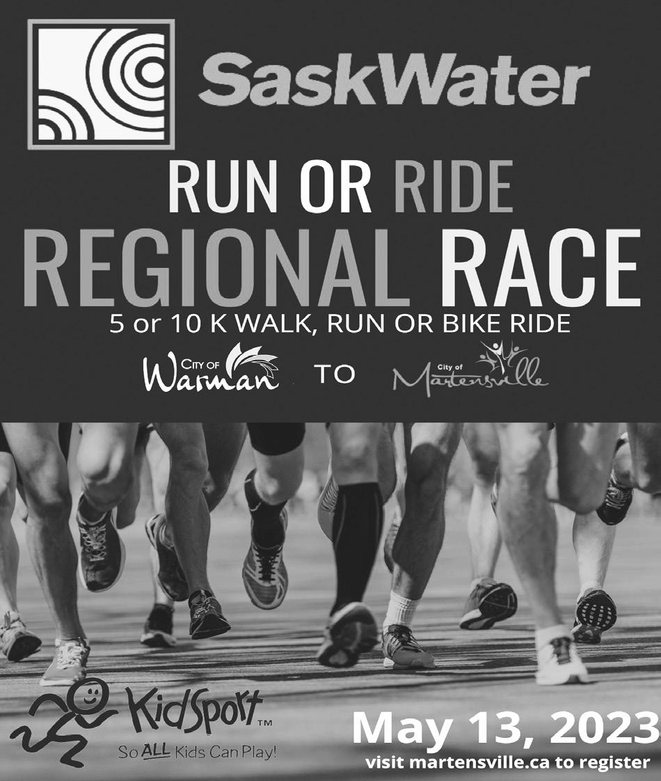 The SaskWater Regional Race: Run or Ride will be taking place on May 13th, with the course beginning in Warman at the Prairie Oasis park and ending in Martensville at the North Ridge Community Centre. Once complete, there will be a shuttle available to bring you back to the start line from the finish line.