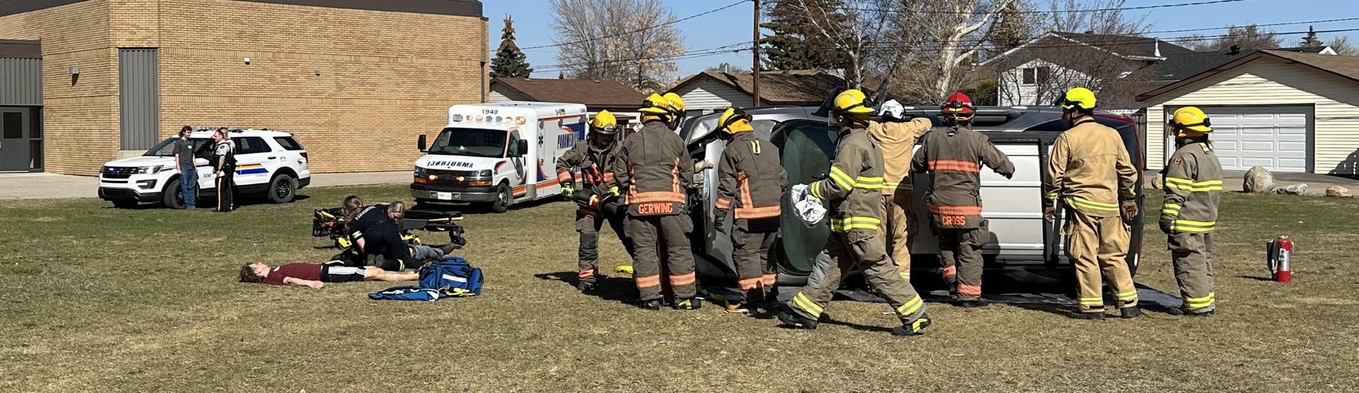 The mock accident scenario started in front of Martensville High School with a vehicle lying on its’ side, two victims outside the vehicle, one trapped inside (mannequin) and one who walked away from the scene. Martensville Fire Department did an extrication of the vehicle to remove a trapped patient as students participated in the mock accident scenario. Victims of the ‘accident’ were played by student actors who were assessed, rescued, and treated at the scene by Martensville