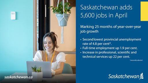 Newly released labour force numbers from Statistics Canada for April show strong, continued growth in Saskatchewan's economy, with 5,600 new jobs when compared to April 2022. All job growth was full time employment.