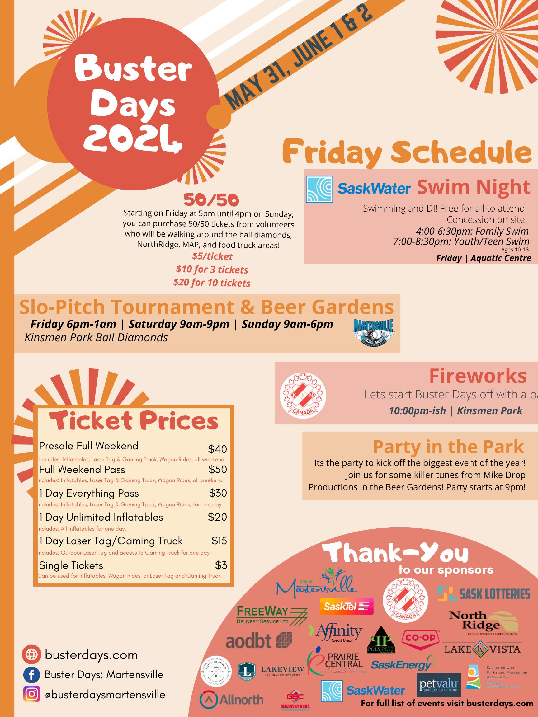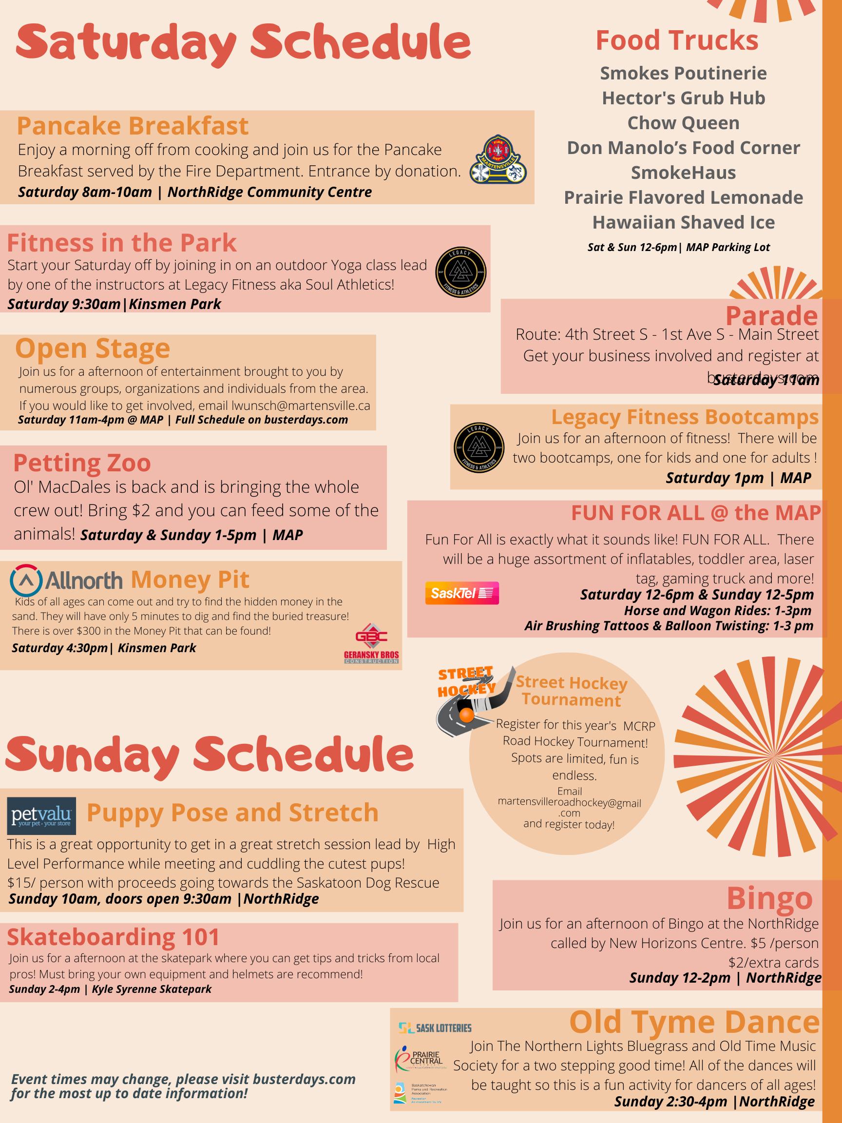 306-934-6610 601 Centennial Dr. South Martensville • GARAGE • DECK & FENCE • WINDOW PACKAGES AVAILABLE “LET US HELP YOU MAKE YOUR HOME AND YARD WHAT YOU DREAM OF” mbhs.ca 1 Spring Volleyball Leagues Begins 2 Outdoor Pickleball begins (weather pending) 3 Drop-In Art Hive 4 NDP/CANWEST Amazing Race 5 Art Classes Begin Martensville Slo-Pitch Season Begins 8 Sportball T-ball/Soccer Begins 9 City Program Registrations including Swimming Lessons Begin at 9:00 am Tennis Begins 11 NDP/CANWEST Regional Race: Run or Ride 22 City Facilities Closed 24 Prairie Sky Business Excellence Award Gala 24 - 25 NDP/CANWEST Monster Garage Sale 26 Lions Club Pet Valu Walk for Dog Guides 31 Buster Days 1 Library Storytime in Andrea’s Park 2-10 Library I Spy in Andrea’s Park 5 City Facilities Closed 6-15 Sculptors’ in the Park – Explore, Experience, Enjoy 8 Library Storytime in Andrea’s Park 12 Fall Registration Opens at 9:00am Set I Swimming Lessons Begin 12-17 Wheatland Library Storybook Trail “Perfectly Pegasus” 15 Library Storytime in Andrea’s Park 16 Sculptors’ in the Park – Explore, Experience, Enjoy Grand Finale 16-18 Martensville Slo-Pitch Playoffs 20 Summer Basketball Camp Begins 21 Library Stuffed Animal Sleepover 22 Library Storytime in Andrea’s Park 24 Martensville 3-on-3 Hockey Tournament 27 Summer Volleyball Camp Begins 1 City Facilities Closed Set C & D Swimming Lessons Begin Lazy Man Triathlon Begins TD Summer Reading Club Begins 1-5 Library I Spy in Andrea’s Park 2 Schools Out for Summer Sports Begins The Martensville Trio Returns Outdoor AquaFit Begins 3 Body Sculpt Begins 4 Sportball T-ball/Soccer Begins RIP Group RX Begins Library Storytime in Andrea’s Park 8-13 Wheatland Library Storybook Trail “Brave Dave” 11 Library Storytime in Andrea’s Park 15 Set E Swimming Lessons Begin 17 Library Great Outdoors Play Day 18 Library Storytime in Andrea’s Park 22-27 Wheatland Library Storybook Trail “Lucky Me” Library I Spy in the Library 23 Schools Out for Summer Recreation Begins 25 Fall Program Guide Available On-line Library Storytime in Andrea’s Park 27 Set F Swimming Lessons Begin 29 Set G & H Swimming Lessons Begin 31 Lazy Man Triathlon Ends 1-2 Buster Days 1 Aquatic Centre Opens MCRP Street Hockey Fun Day Maddog Fall Football Registration Opens Spray Park Opens ParticipACTION Comunity Challenge Begins 3 Set A Swimming Lessons Begin 8 Babysitting Program Begins First Aid CPR/Recert Begins 9 Staying Home Alone 14 Drop-In Art Hive 17-22 Wheatland Library Storybook Trail “Gigantic” 22 Summer Market Begins 25 Youth Gymnastics Begins Gentle/Yin Yoga Begins 26 Toddler Gymnastics Begins 28 - 30 Library I Spy in Andrea’s Park 29 Set B Swimming Lessons Begin Learn To Run Begins 30 ParticipACTION Free Drop-In