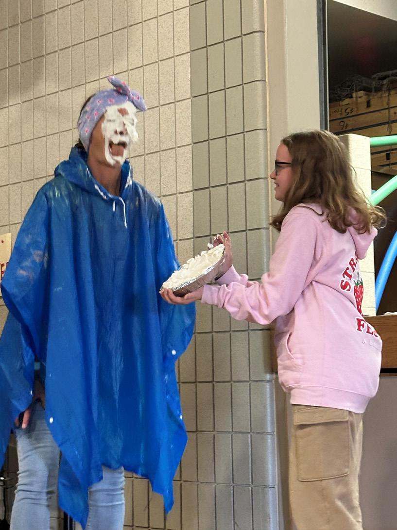 ABOVE: Willa Edmonds has the fun task of throwing a pie in Ms. Tremain’s face at the Terry Fox Fundraising assembly.