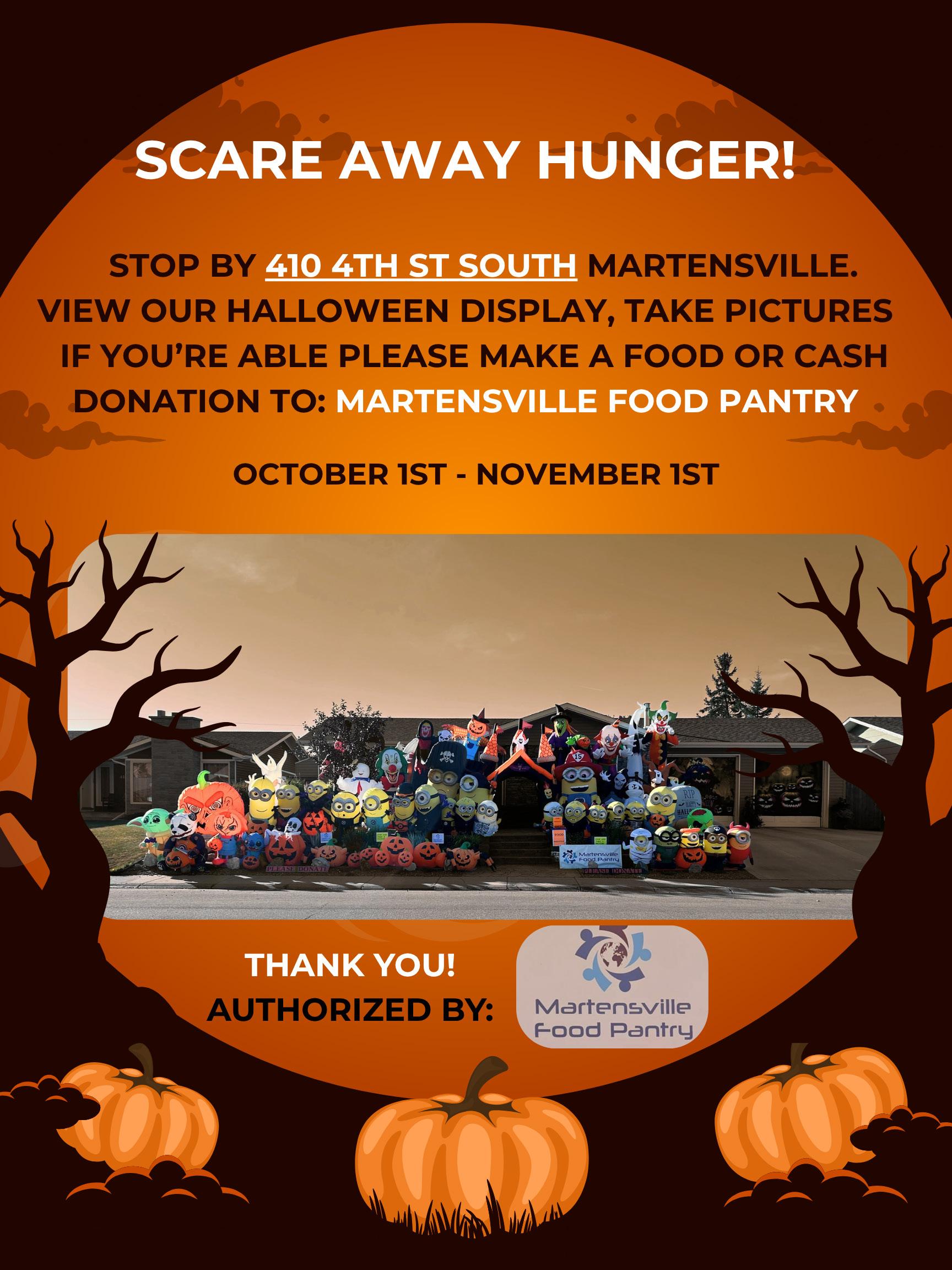 This display is part of the Martensville Food Pantry’s Scare Away Hunger campaign. If you’re able, please consider making a food or cash donation to support the Martensville Food Pantry and help local families in need.