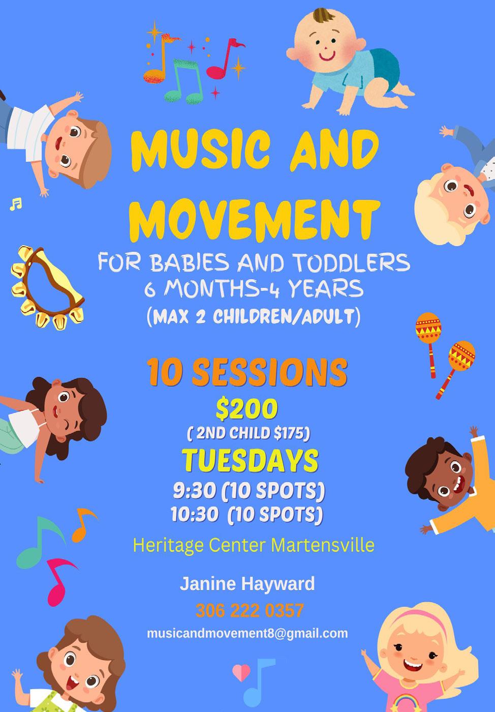 Details - Classes are Tuesday mornings either 9:30-10:30, or 10:30 to 11:30 at the Martensville Heritage Center. There are 10 sessions offered for 200.00 for 1 child and an additional child is 175.00. If the full-time sessions are not full, I will offer drop-ins for 25.00 a class. Please, no food but water bottles are welcomed. Indoor shoes required. Funds can be e-transferred to musicandmovement8@ gmail.com . Classes start on Oct. 1. There is no class Oct. 22 because of the election. Classes are Oct. 1, 8, 15, 29, Nov. 5, 12, 19, 25 Dec. 3, 10.
