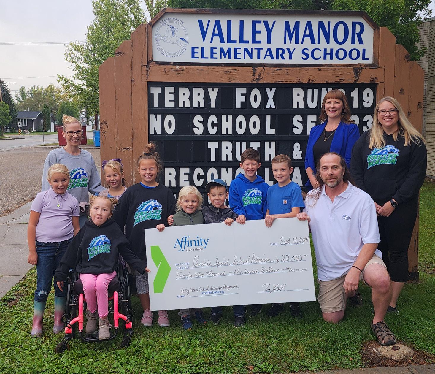 RIGHT: Ron Gurski (Front Right) of the Affinity Credit Union North Member Council visited Valley Manor Elementary School on Thursday, September 19th to present a cheque for $22,500 which will go towards the VMS School Community Council’s goal to create an inclusive playground for the childen of Martensville.
