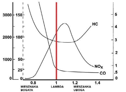Ilustracja 2. Zmiana składu spalin w zależności od współczynnika lambda. Źródło: Motofaktor.pl